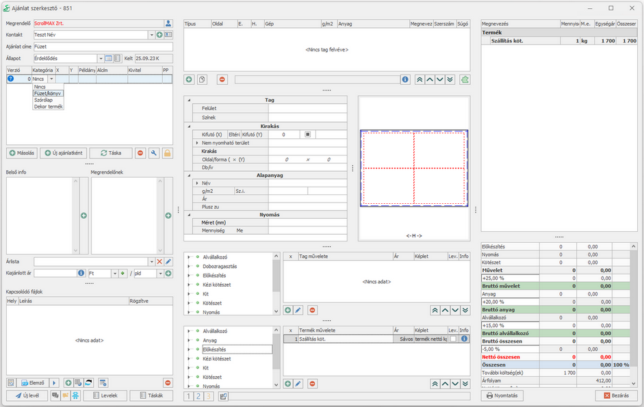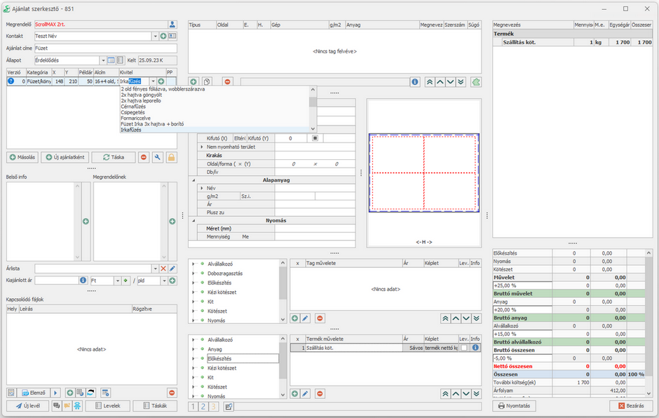 20. A termékhez tartozó műveletek felvétele: irkafűzés, szállítási díj