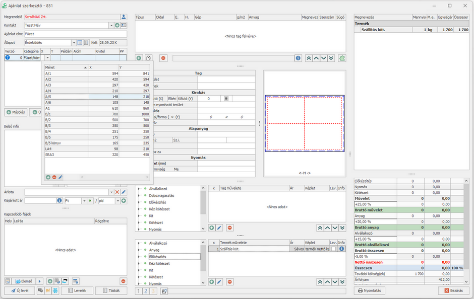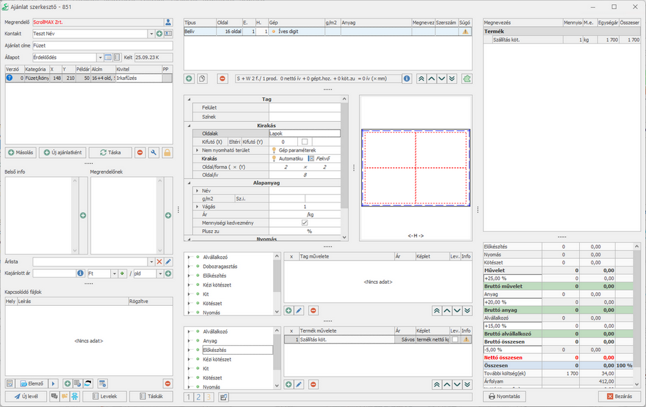 17. Az új tagot beparaméterezzük a 10.-től a 13.-ig lépésekkel a következő adatok szerint: Borító, 4 oldal, E. (előoldal) + H. (hátoldal) 4+4, 170 g/m2-es 450*320 mm-es papír.