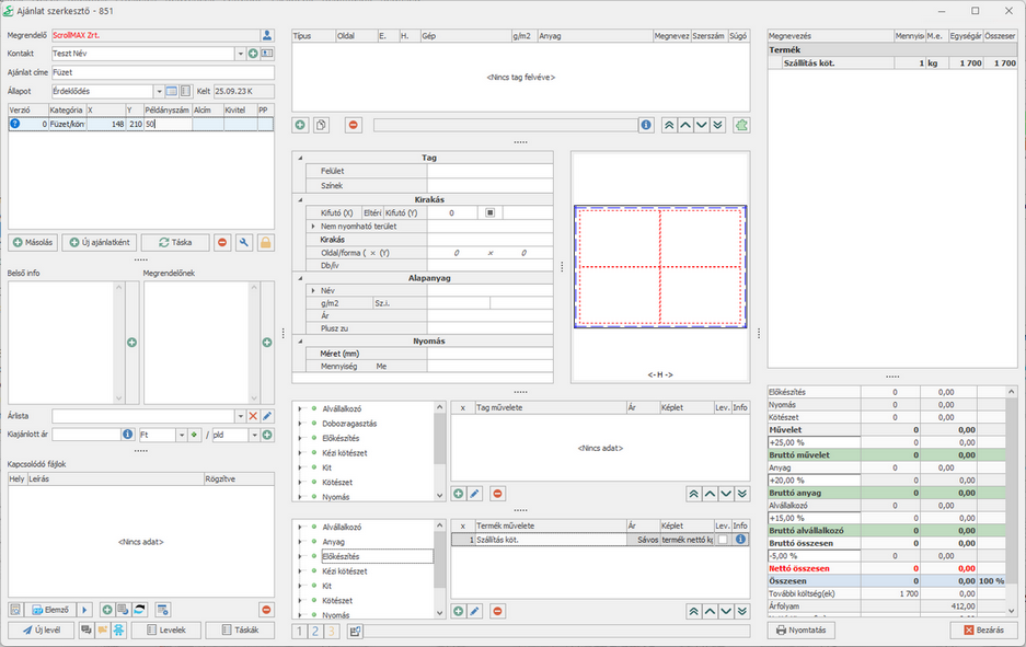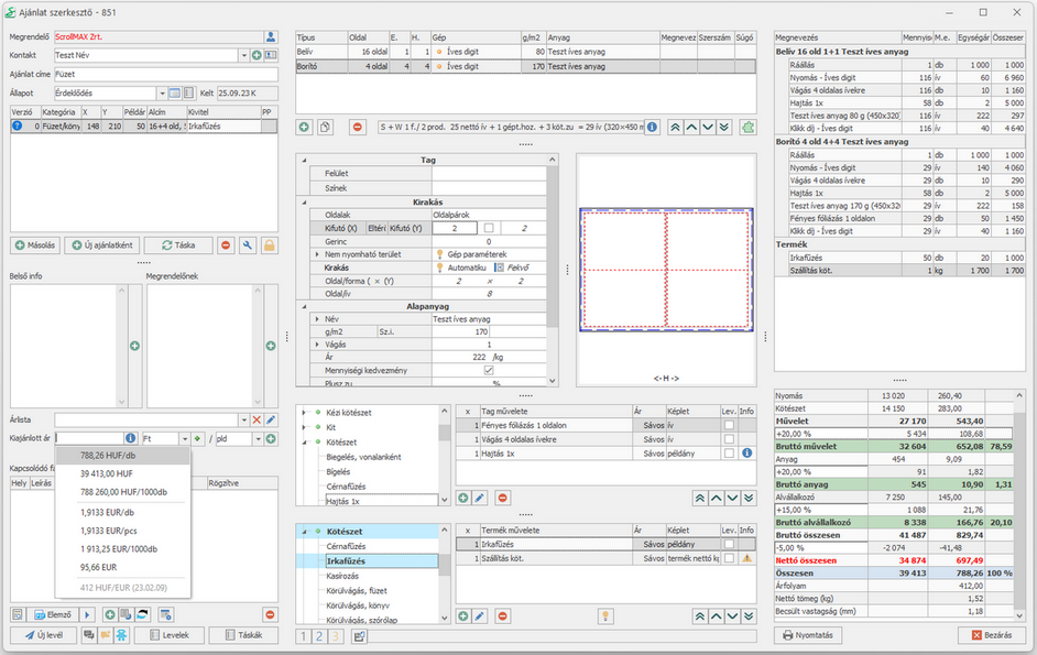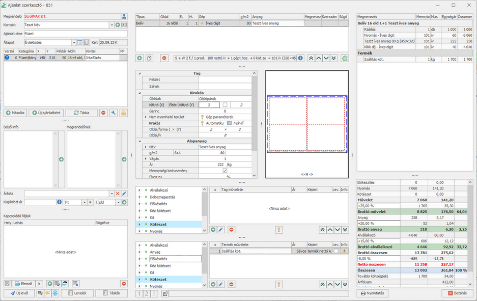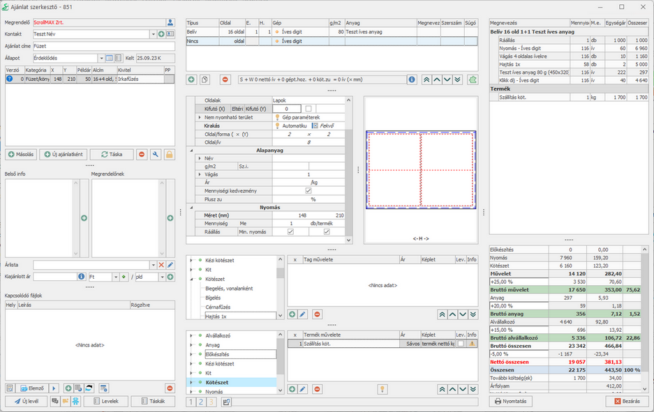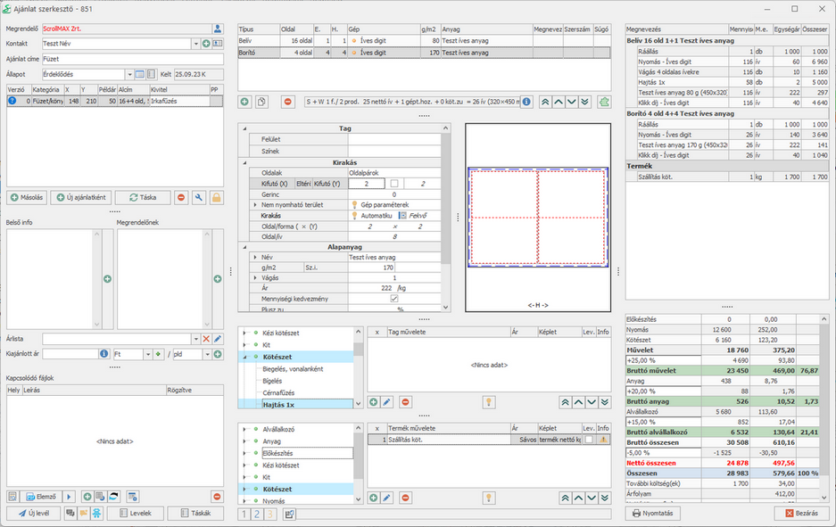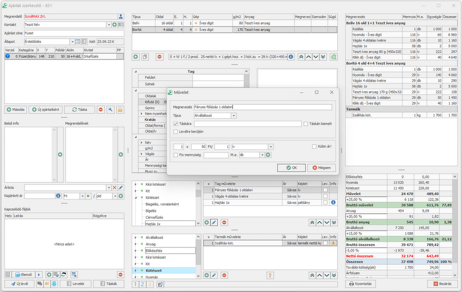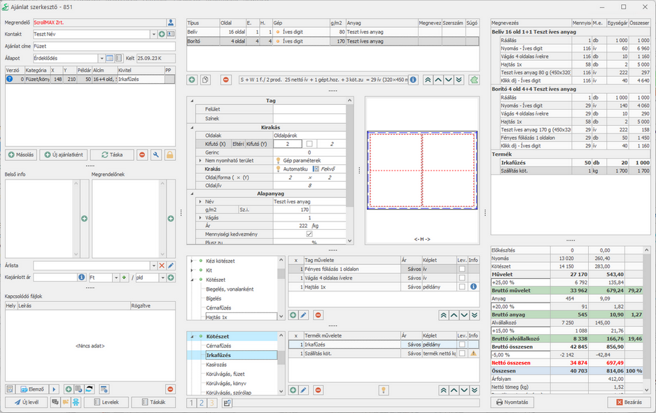 A belíveket és az alvállalkozó által fóliázott borítót négy oldalas kilövésben egyszer hajtjuk a hajtogatógépen, majd az irkafűző géppel tűzzük. Számolunk még egy alap szállítási költséget a termékre.