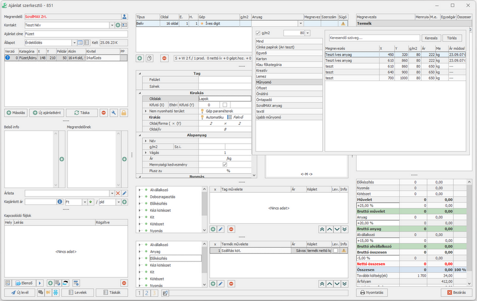 13. A nyomathordozó Anyag kiválasztása a lenyíló táblázatból. A példa kalkulációban ez a 80 g/m2-es, 450*320 mm-es papír kiválasztása.