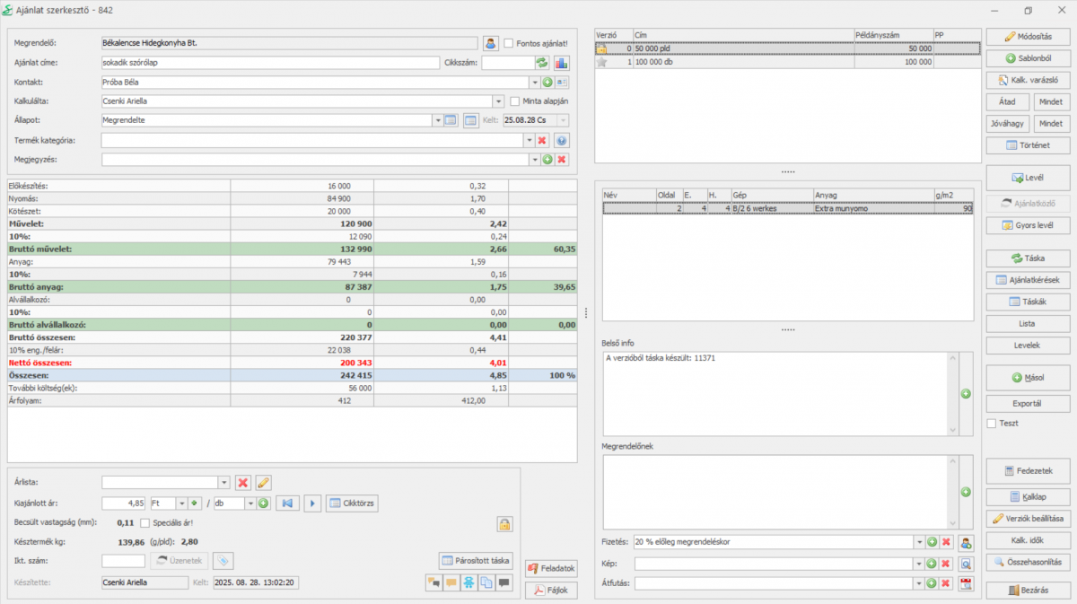 Az Ajánlat szerkesztőn egy adott árajánlattal kapcsolatos valamennyi információt, adatot tudja egyben kezelni: a különböző verziók árai, fedezeti kimutatásai mellett egy gombnyomással elérhetők az ajánlattal kapcsolatos események, csatolt fájlok (ajánlatkérő e-mail, minták, tervek), az esetleges alvállalkozói ajánlatkérések és az azokra kapott válasz.
